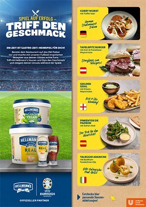 Nutze außerdem die Fan-Stimmung deiner Gäste und passe deine Angebote an. Egal, wie deine EM-Taktik aussieht, ob mit oder ohne Public Viewing – mit unserem hochwertigen Merchandise-Paket und unseren Rezeptideen bringst du Stadion-Flair in deine Location. So wird’s ein Volltreffer für alle!