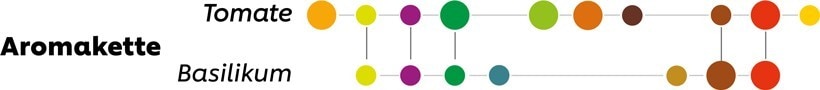 Siehst du einen farbigen Punkt, so ist das entsprechende Aromamolekül in dem Lebensmittel vorhanden, je größer, desto ausgeprägter. Aromaketten bilden die Schlüsselaromen ab, je mehr gemeinsame Punkte, umso besser passen die Zutaten zusammen. Kombiniert man Tomate mit Basilikum oder im Vergleich mit Erdbeere, wird der Unterschied deutlich.