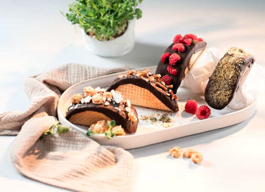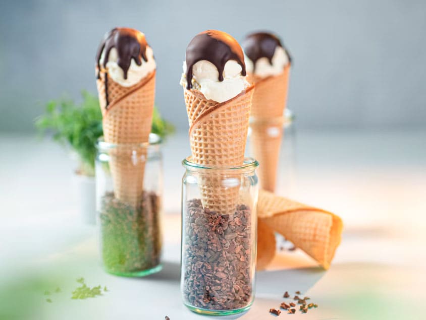 Innovatives neues Schokoladen-Topping, dass bei Kontakt mit gefrorenen Dessert- oder Eiskreationen knackig wird . Für ein unvergessliches Geschmackserlebnis.