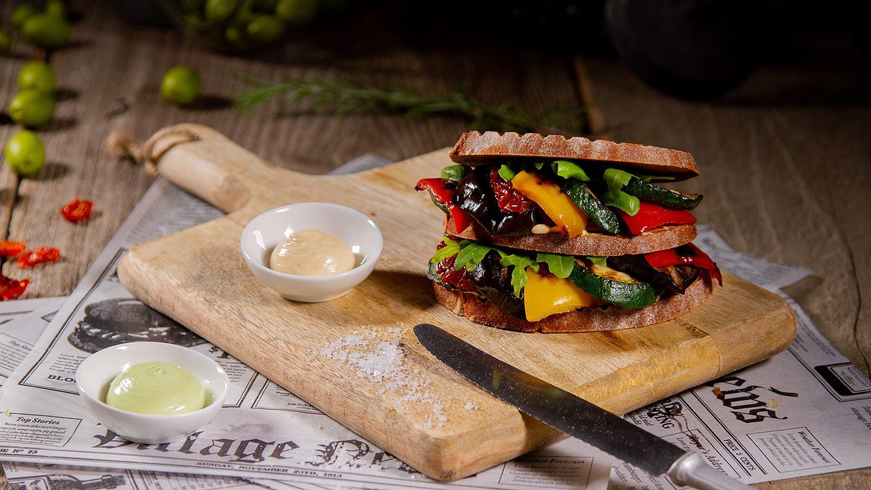 Anti Pasti Verdi Sandwich mit Oliven & Paprika Mayonnaise
