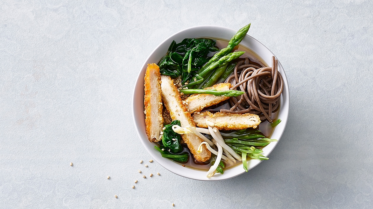 Asia Nudelsuppe mit Crispy-Streifen und Spinat