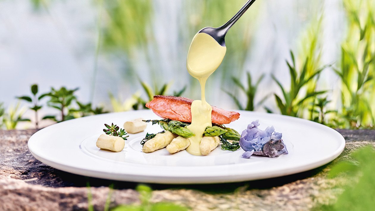 Bachsaibling mit Spargel, Trüffel-Kartoffel und Senf Hollandaise