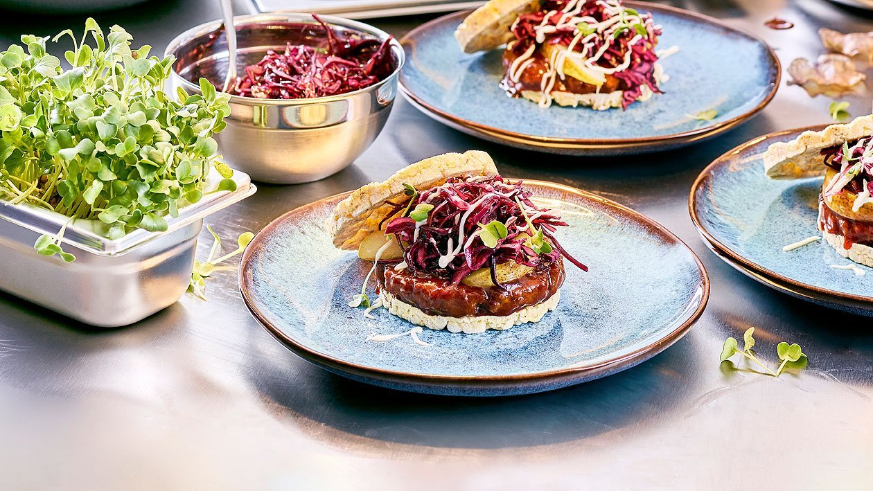 BBQ NoBeef Burger mit Sesam Rotkraut, Birne und Maiswaffel