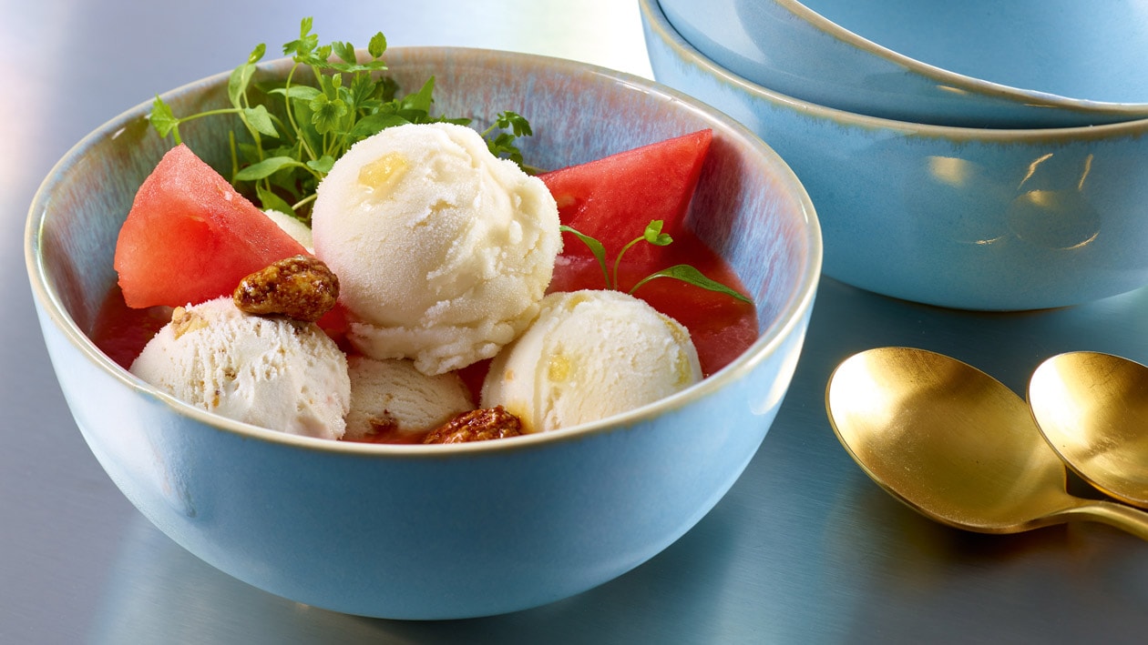 Cremiges Walnuss Eis mit gefrorenem Apfel und Melonenshot