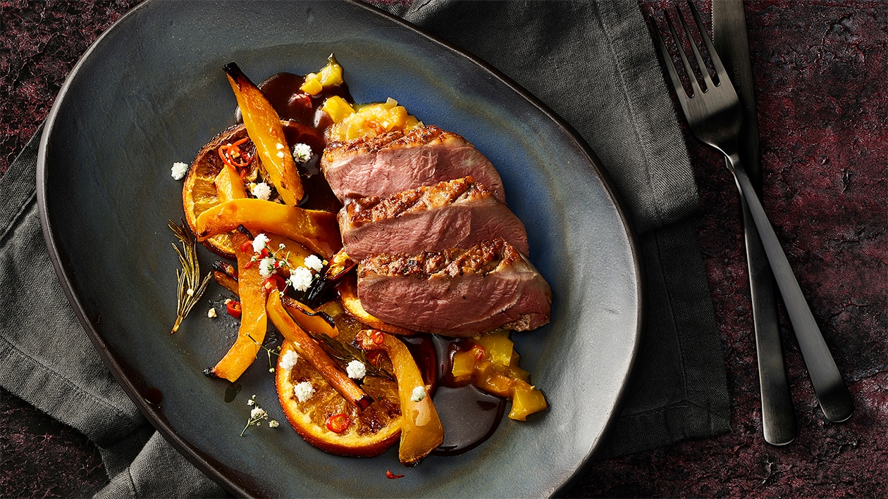 Entenbrust mit Orangenjus und Ofenkürbis