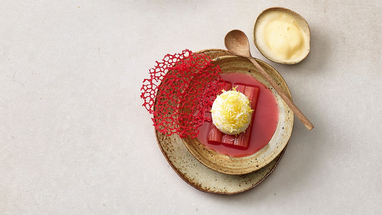 • Rhabarber in tiefe Teller mit Saft anrichten
