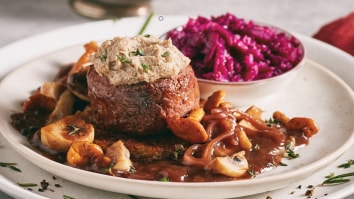 Festmahl ohne Feiertagsbeef mit Pilzmousse, Crouton und Portweinsauce