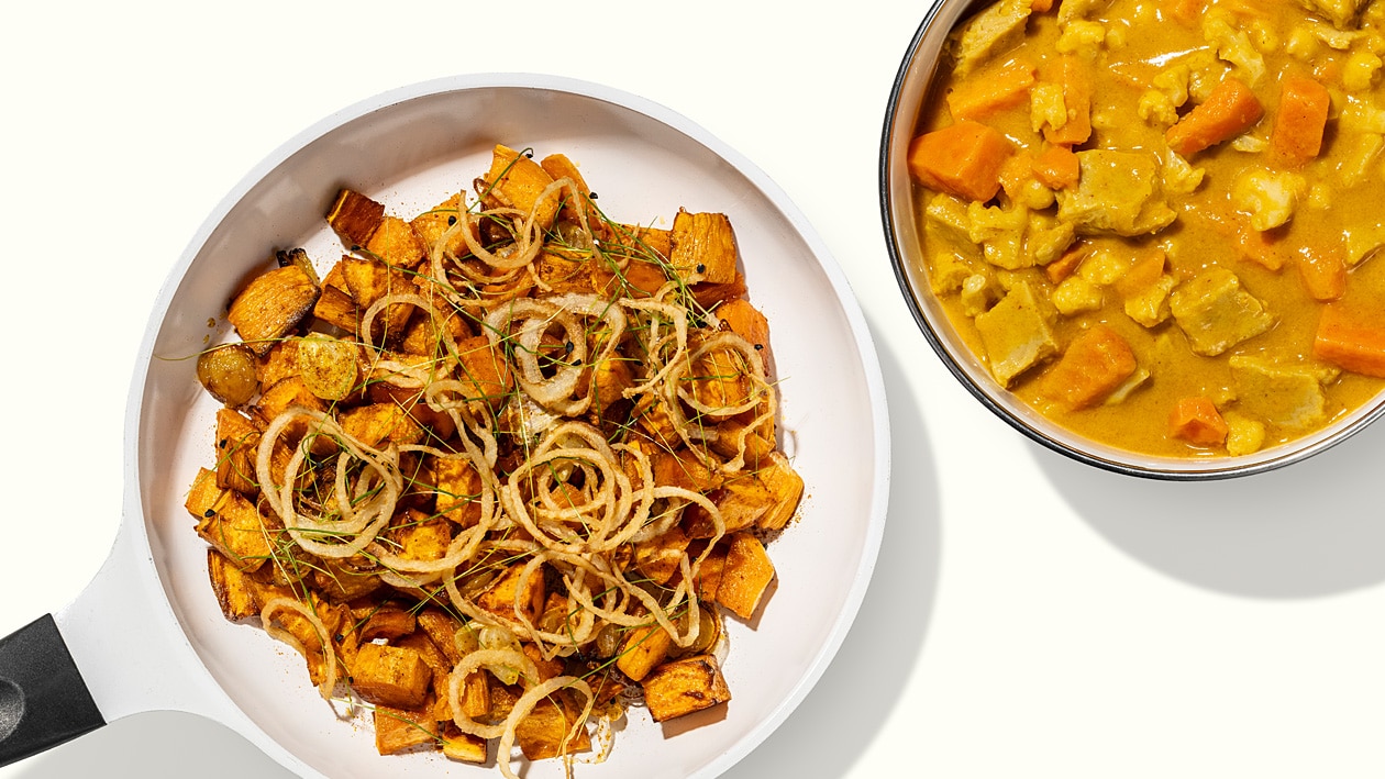 Fruchtiges Curry mit gebackene Würzkartoffeln und Röstzwiebeln