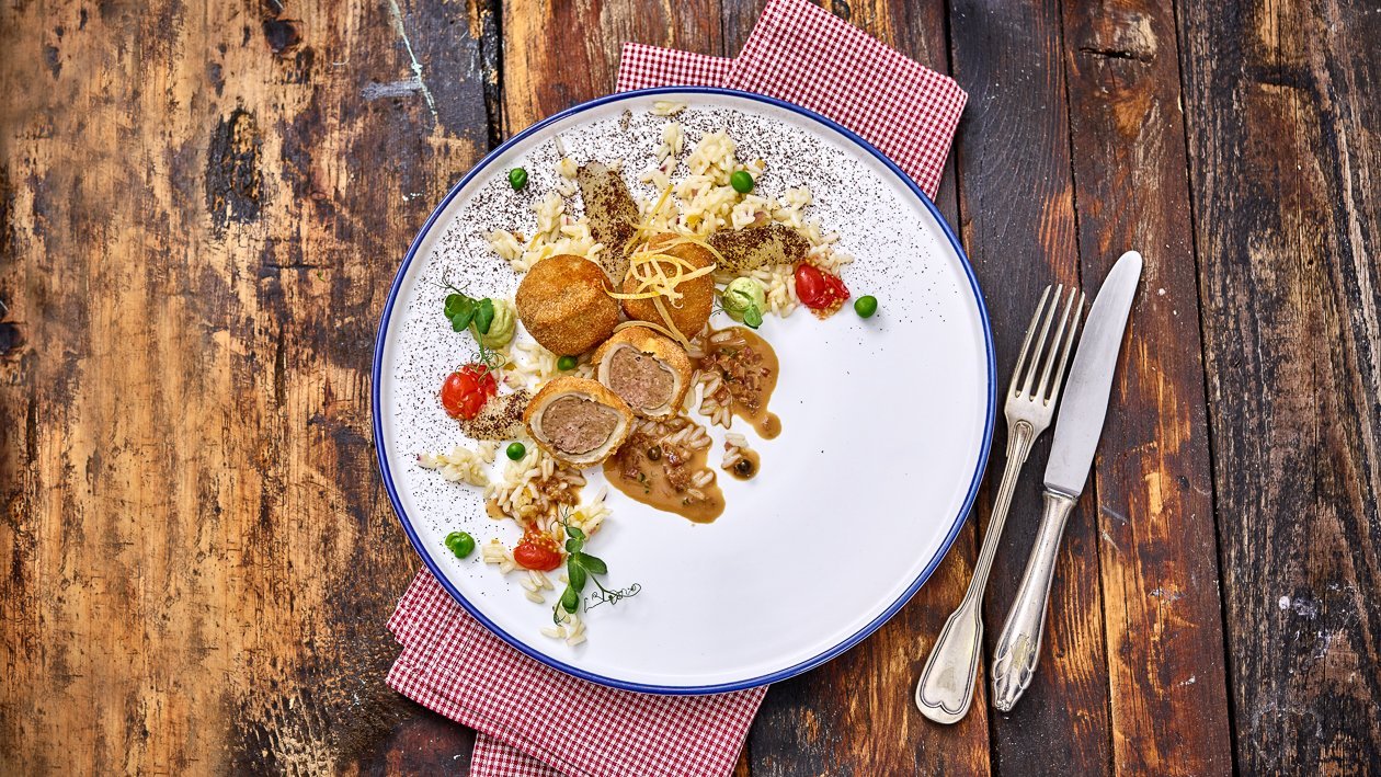 • Faschierbasis wie gewohnt zubereiten, Faschiertes und Petersilie einrühren, kleine Bällchen formen für die Champignonköpfe.