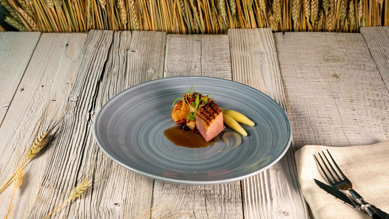 Entenbrust, Kimchi, Schupfnudeln, Pflaumengelee, Sake Jus