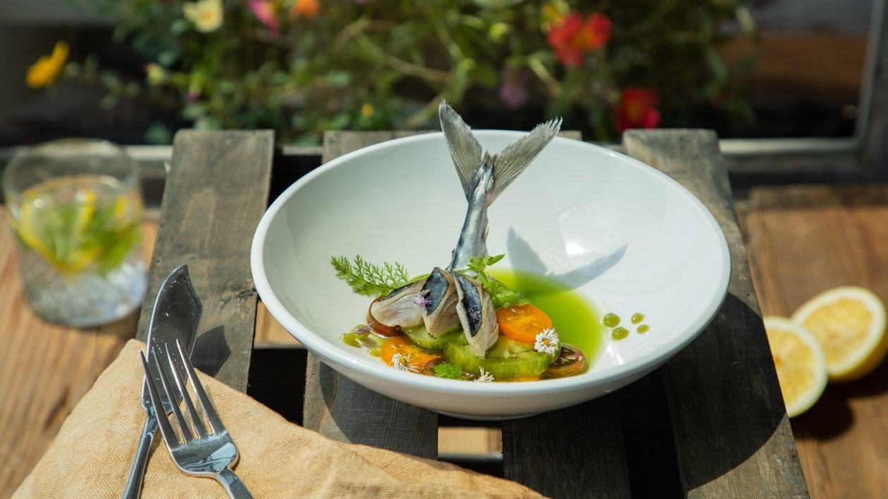 Gebratenes Makrelenfilet auf grünen Tomaten im Gurken - Apfelfond