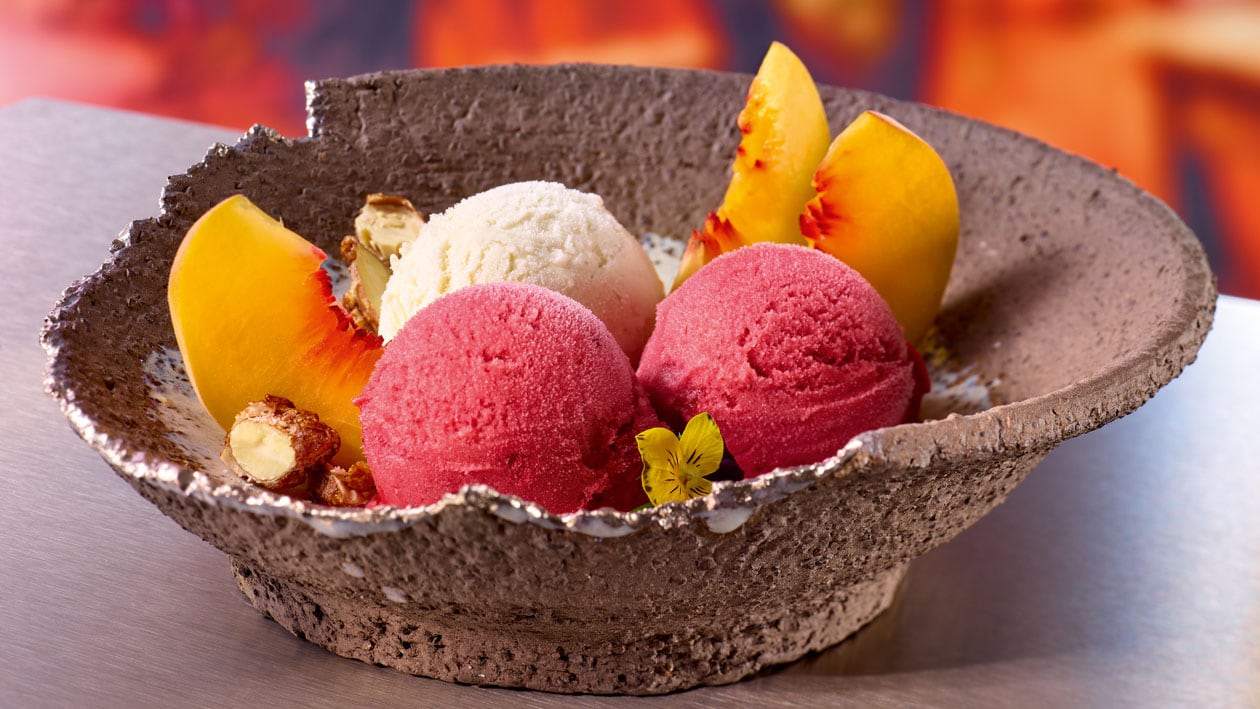 Gefrorene Himbeere und cremige Bourbon Vanille Eis mit Pfirsich und kandierten Mandeln