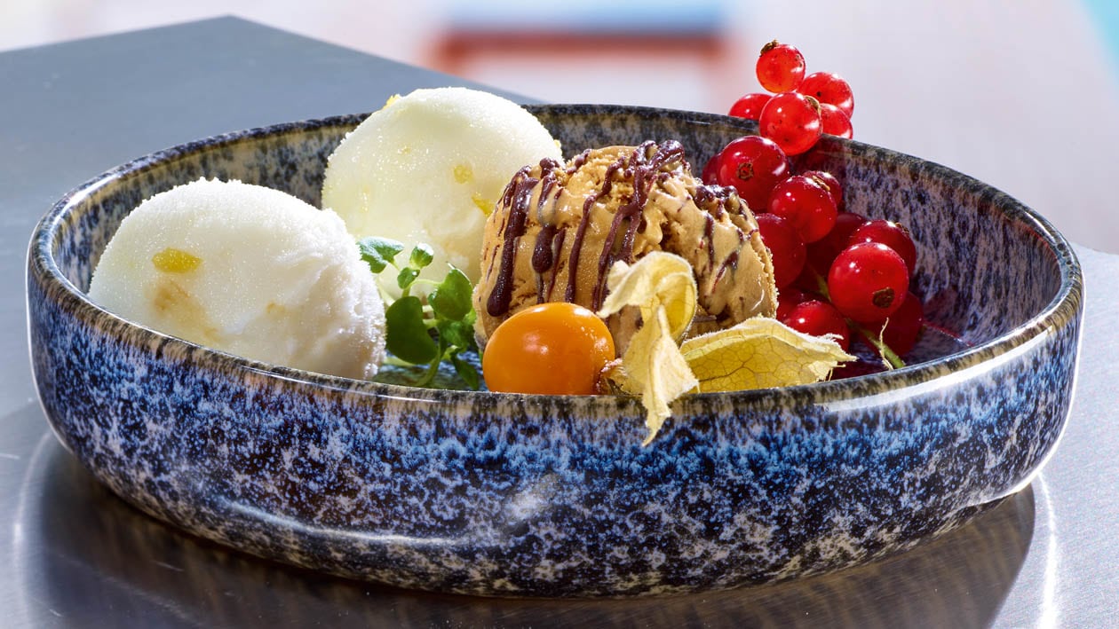 Gefrorenes Kaffee Eis und cremiges Sorbet von der Zitrone mit Johannisbeeren