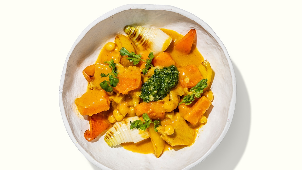 Gelber Gemüsecurry-Topf mit Ofengemüse und Koriander-Pesto