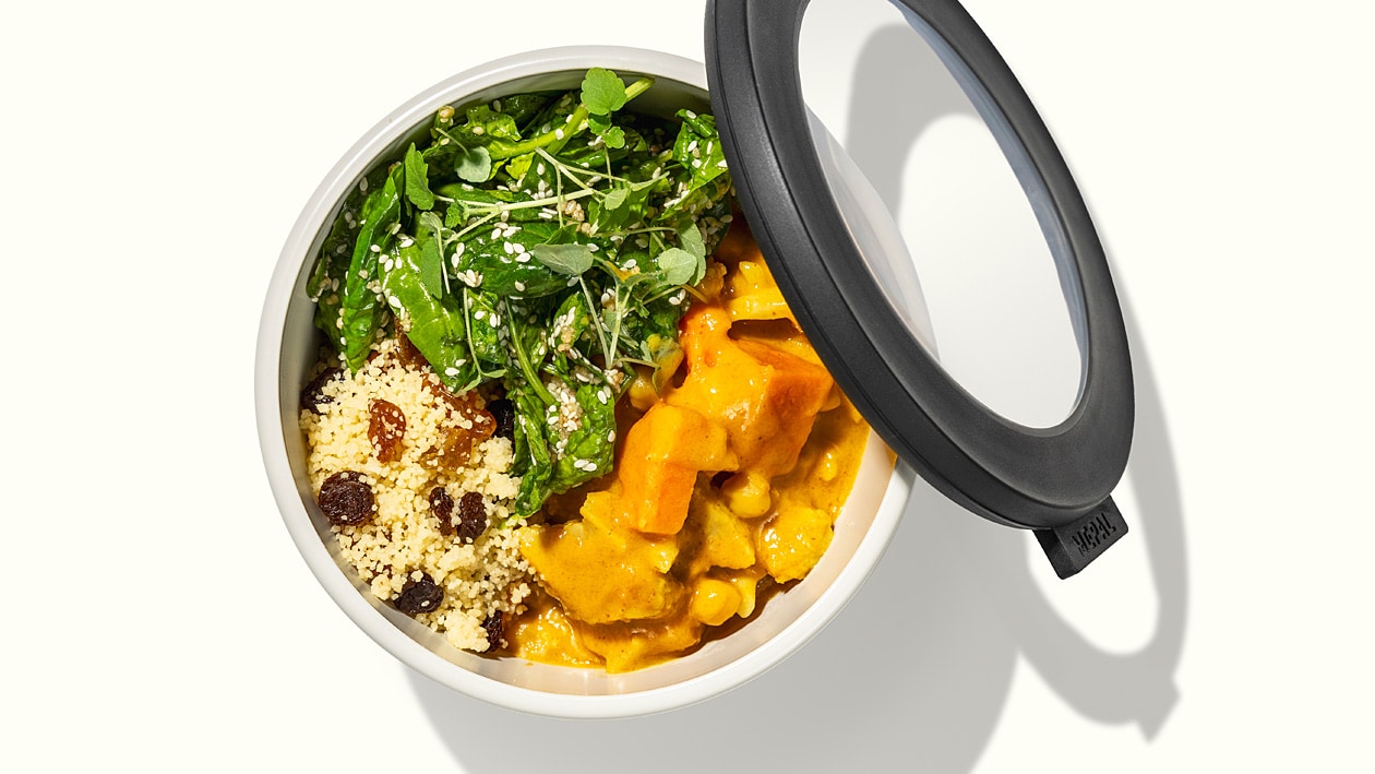 Gelbes Curry mit Rosinen-Cous-Cous und Sesam-Spinat