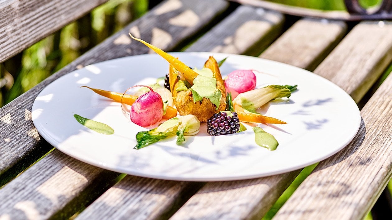 Gemüse Chaos: Grill Batate mit Frühjahrs-Gemüse & geschäumtem Spinat