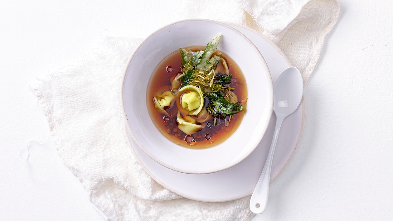 Gemüse-Essenz mit Tortellini und Kräutertempura