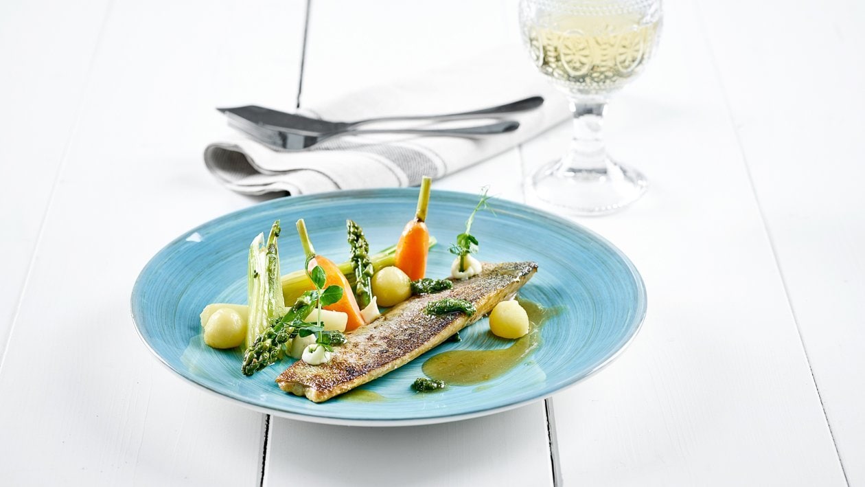 Geräuchertes Forellenfilet, Nussbutter-Gemüse, Tomaten-Olivenöl Fond