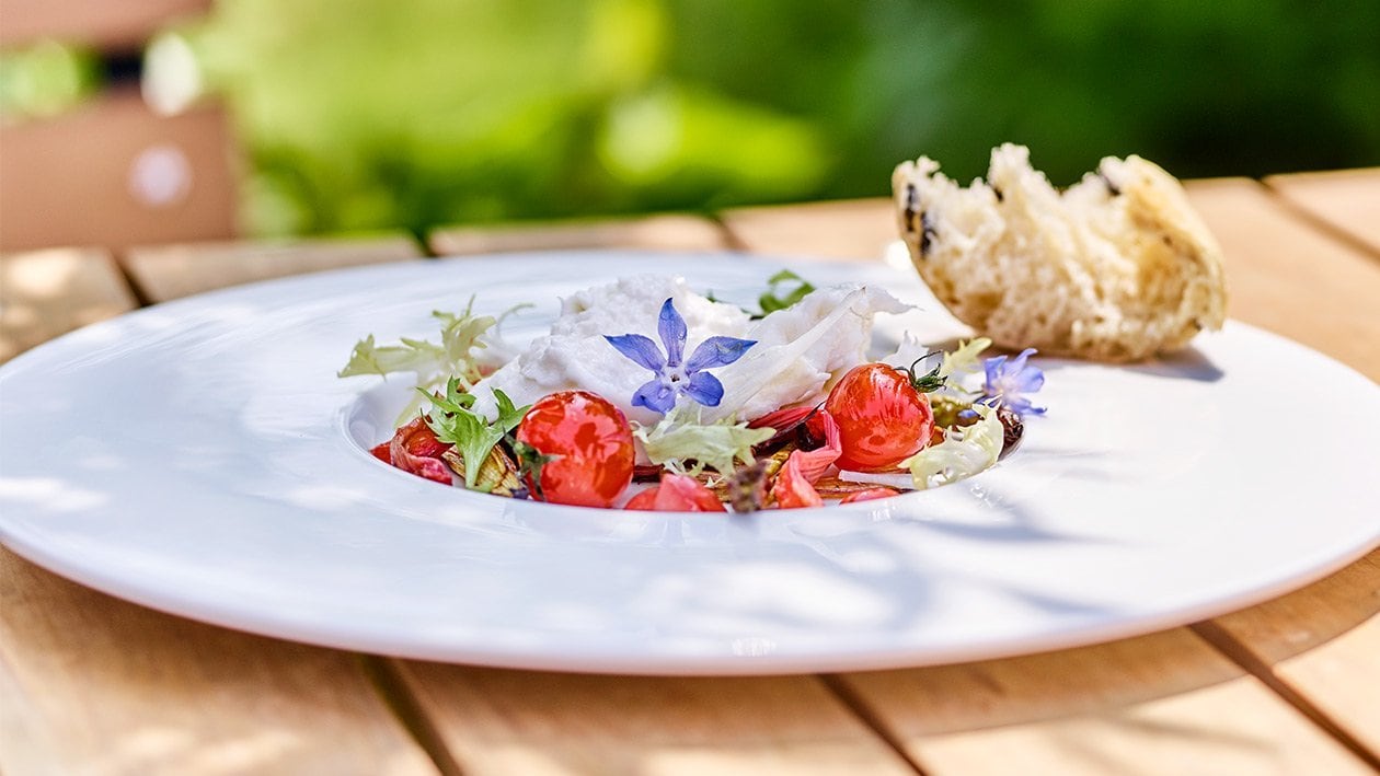 Burrata mit Rhabarber-Spargel & konf. Tomaten