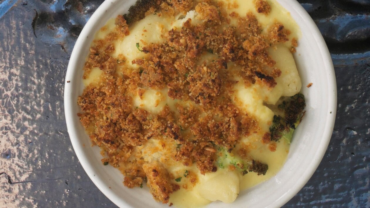 Gnocchi mit Karfiol und geräucherter Tofu-Brotkruste