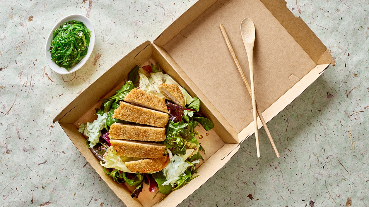 Große Salatschale mit veganen Schnitzelstücken und Lime-Wakame Dip