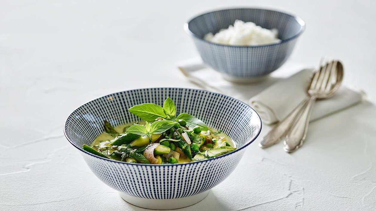 Grünes Curry mit Spargel, Schalotten und Erbsen