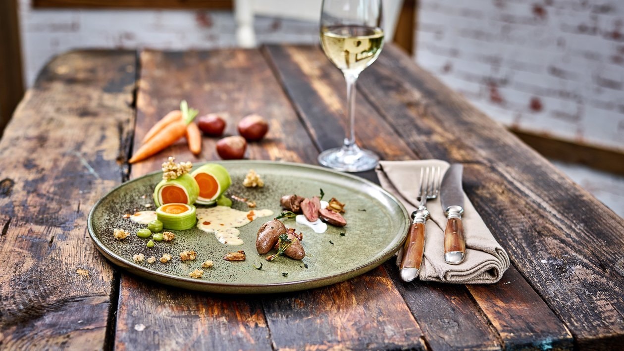 Karotte, Lauch, Senfsauce, Buchweizen, Petersilienasche, Hühnerherzen