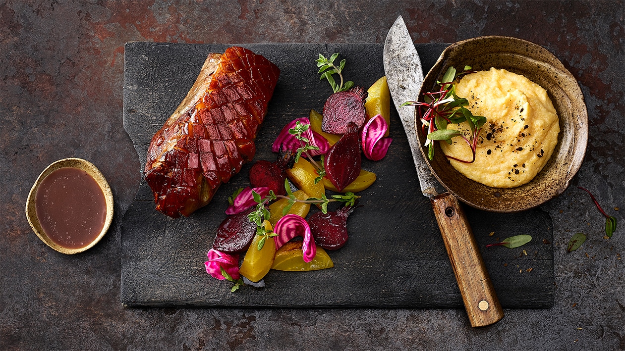 Kren-Krustenbraten mit Polenta und Rote Rüben