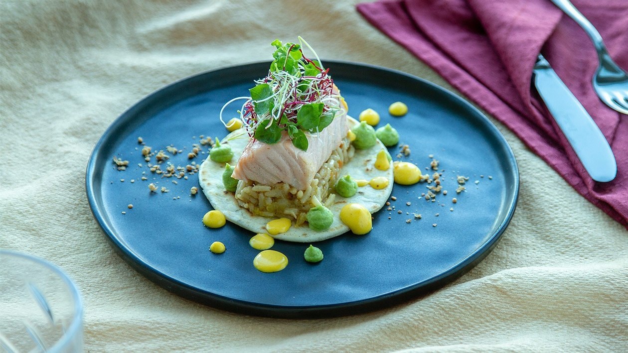 Lachs-Tortilla mit Erbsenpüree und Safran-Hollandaise