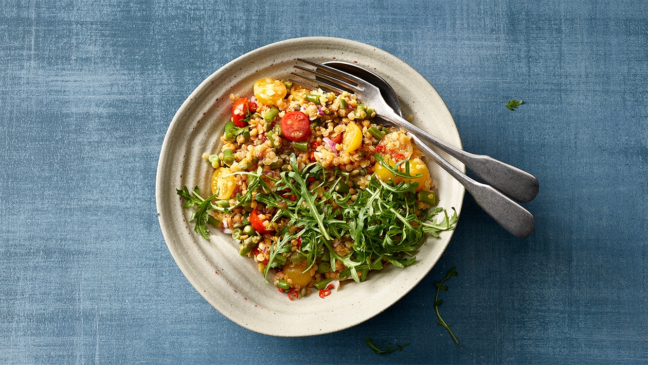 • Restliche Zutaten außer Rucola beigeben und mit der Hellmann's Vinaigrette Balsamico abschmecken