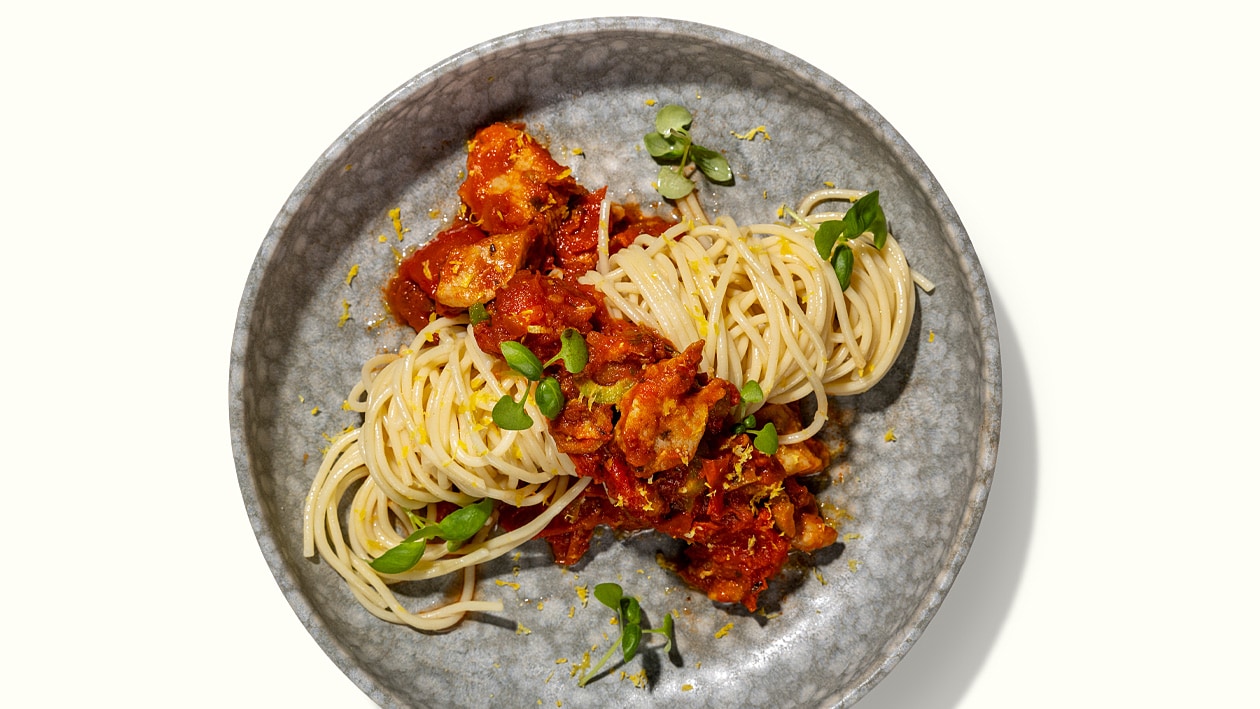 Mediterrane Zitrus-Spaghetti mit fruchtigem Tomaten-Oliven Ragout und knusprige Kapern