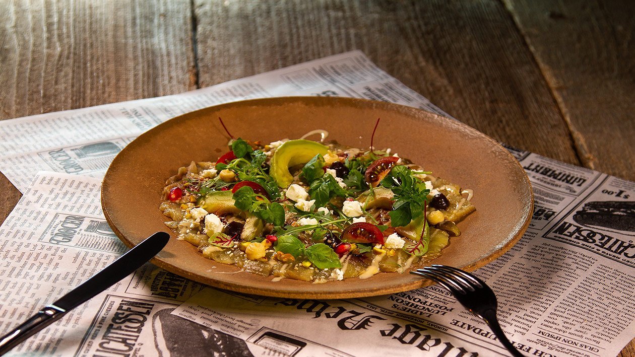 • Die Melanzani auf dem mit Hummus bestrichenen Teller flachdrücken und im Kreis auflegen.