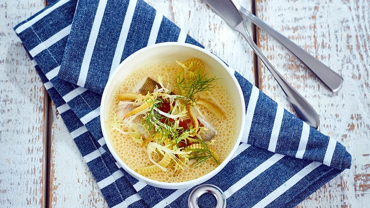 Pochierter Zander auf Miso Schaum und Röstzwiebel Chutney