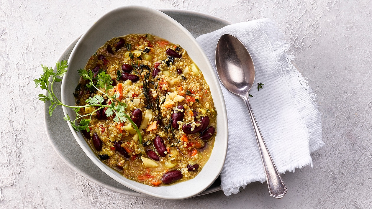 • Quinoa und Rote Bohnen einrühren und aufkochen