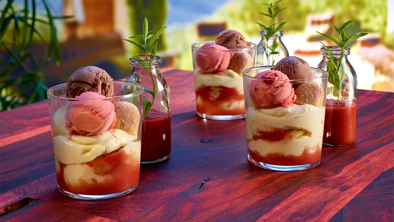• Die Creme in die Gläser füllen und jeweils einen Löffelbiskuit in die Creme stecken.
