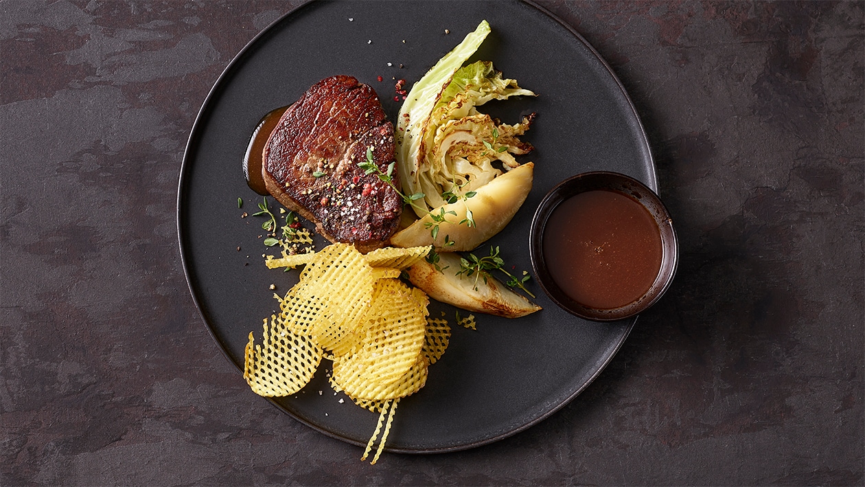 Rindsfilet mit Rotweinsauce, Waffelkartoffeln und Herbstgemüse