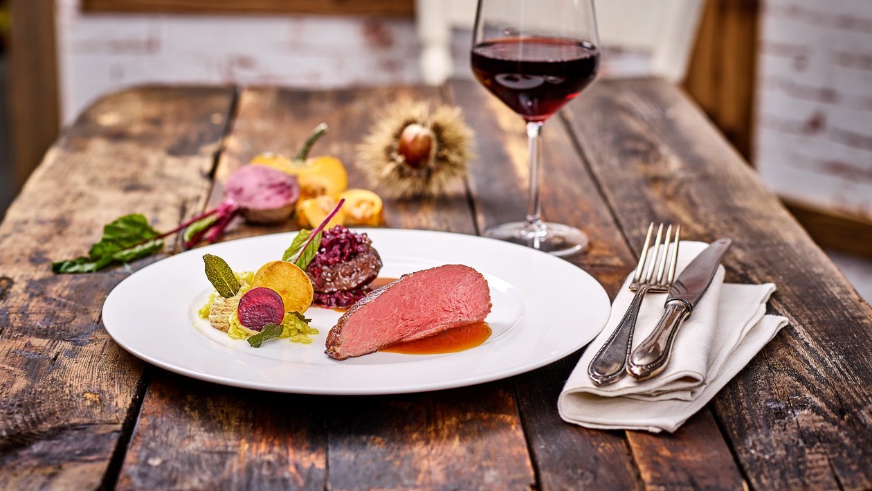• Mire Poix dazugeben und ebenfalls scharf anbraten, mit Tomatenmark tomatisieren und kurz mit rösten. Mit rotem Portwein und Rotwein ablöschen und reduzieren, Ochsenbacken, Kräuter, Gewürze und Knoblauch dazugeben und mit der Goldaugen Rindsuppe aufgießen, schmoren bis sie weich sind, Sauce passieren und zum Garnieren verwenden.