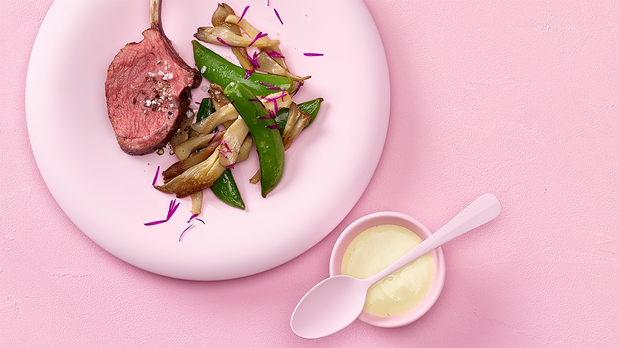 Rosa gebratenes Lammkotelette mit Erbsenschoten-Austernseitlingsgemüse und Rosen-Olivenöl-Emulsion