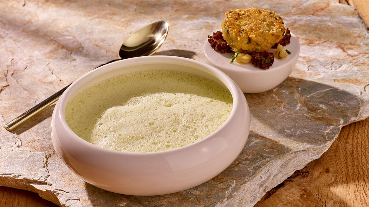 Schaumsuppe vom grünen Spargel, Morchel-Macadamia Pfanne und Haferflockenbratling