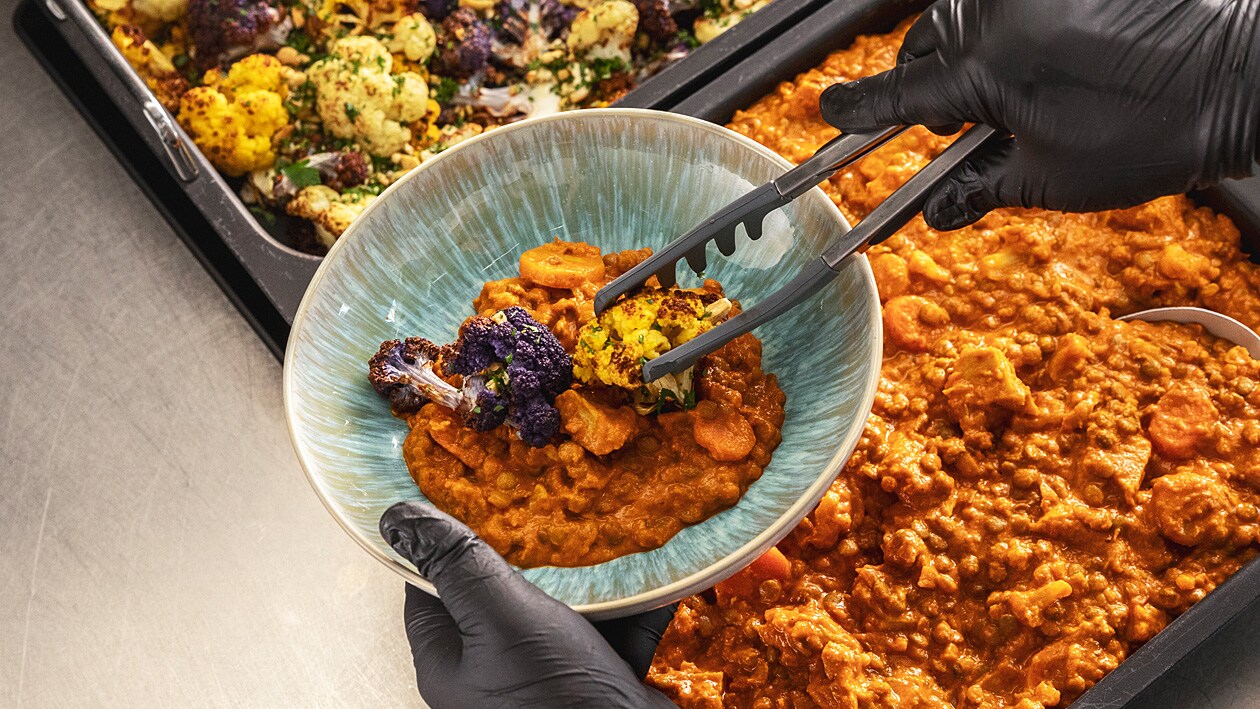 Scheibe vom gegrilltem Karfiol mit Madras Curry abgeschmeckten Linsen Dal
