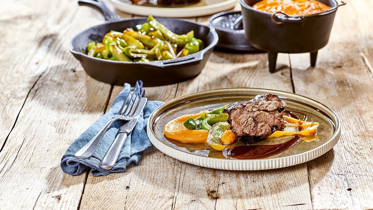 Short Ribs with Grilled Green Pepper and Smoked Sweet Potato Mash