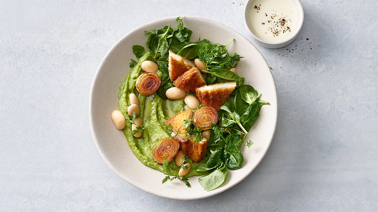 Soissonbohnen-Zwiebelhumus-Bowl mit Crispy-Burger