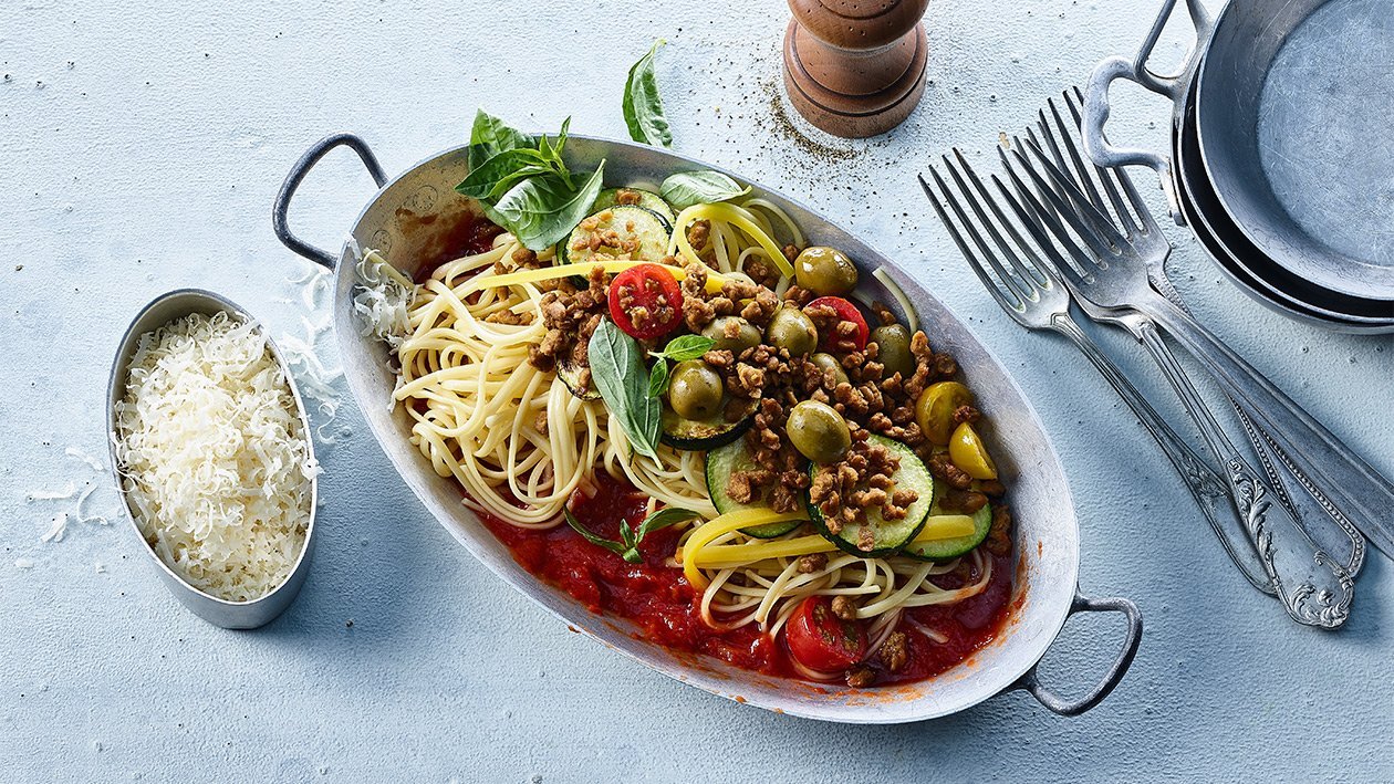 Spaghetti mit Gemüse, Tomatensauce und NoMince