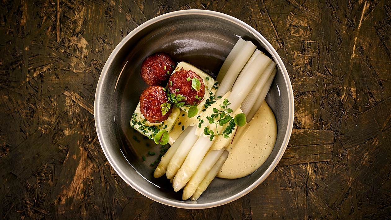 Spargel, No Meatballs, Kartoffelpüree, Limetten-Kren Hollandaise