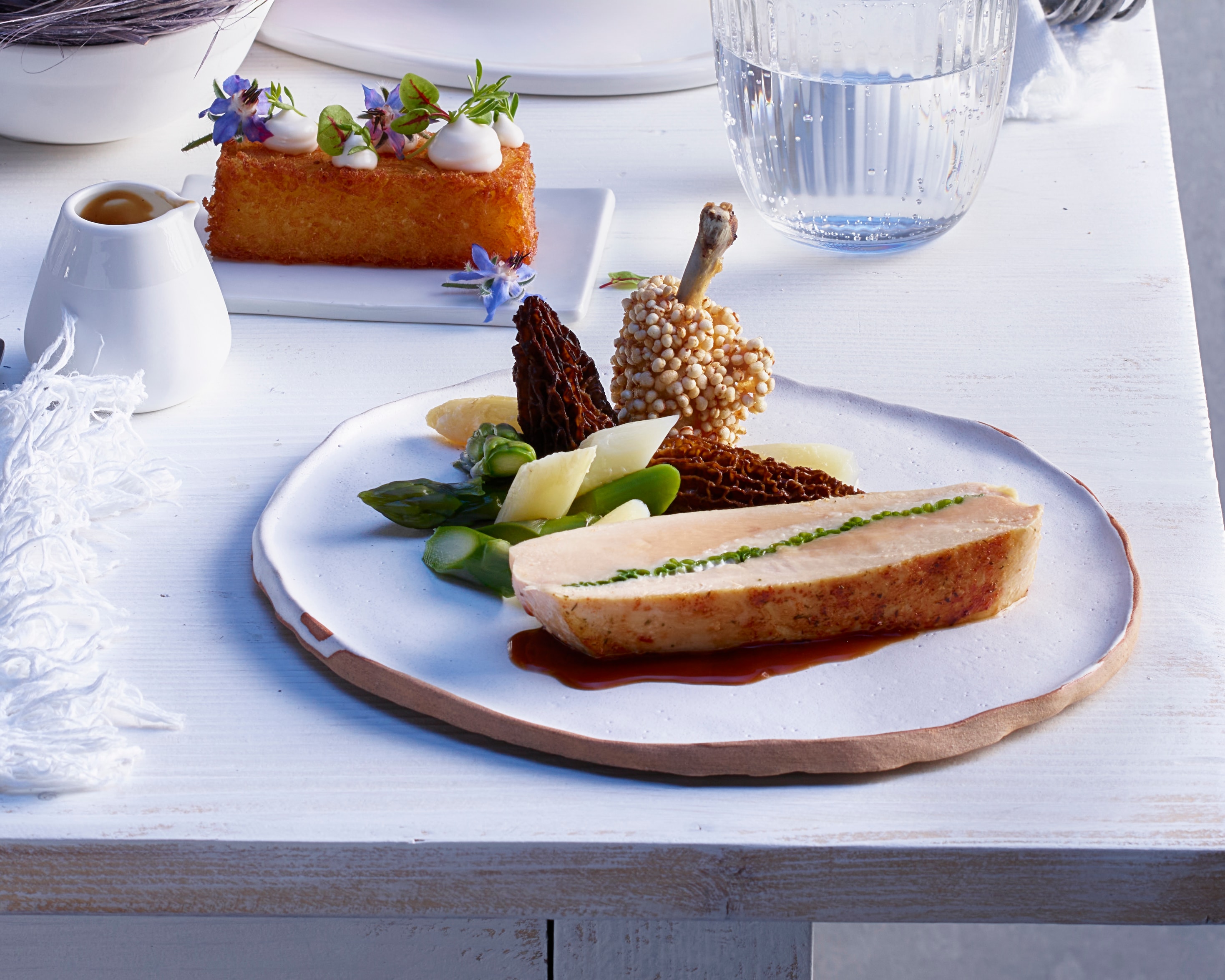 Spargeln mit Rohschinken, Kaffee-Hollandaise und Kresse-Hollandaise