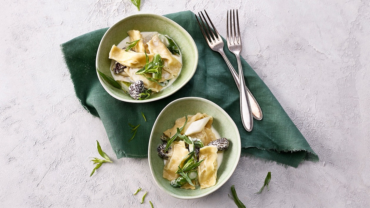 Luftiger Spargelravioli harmonisch vereint mit einer cremiger Morchelnsauce.