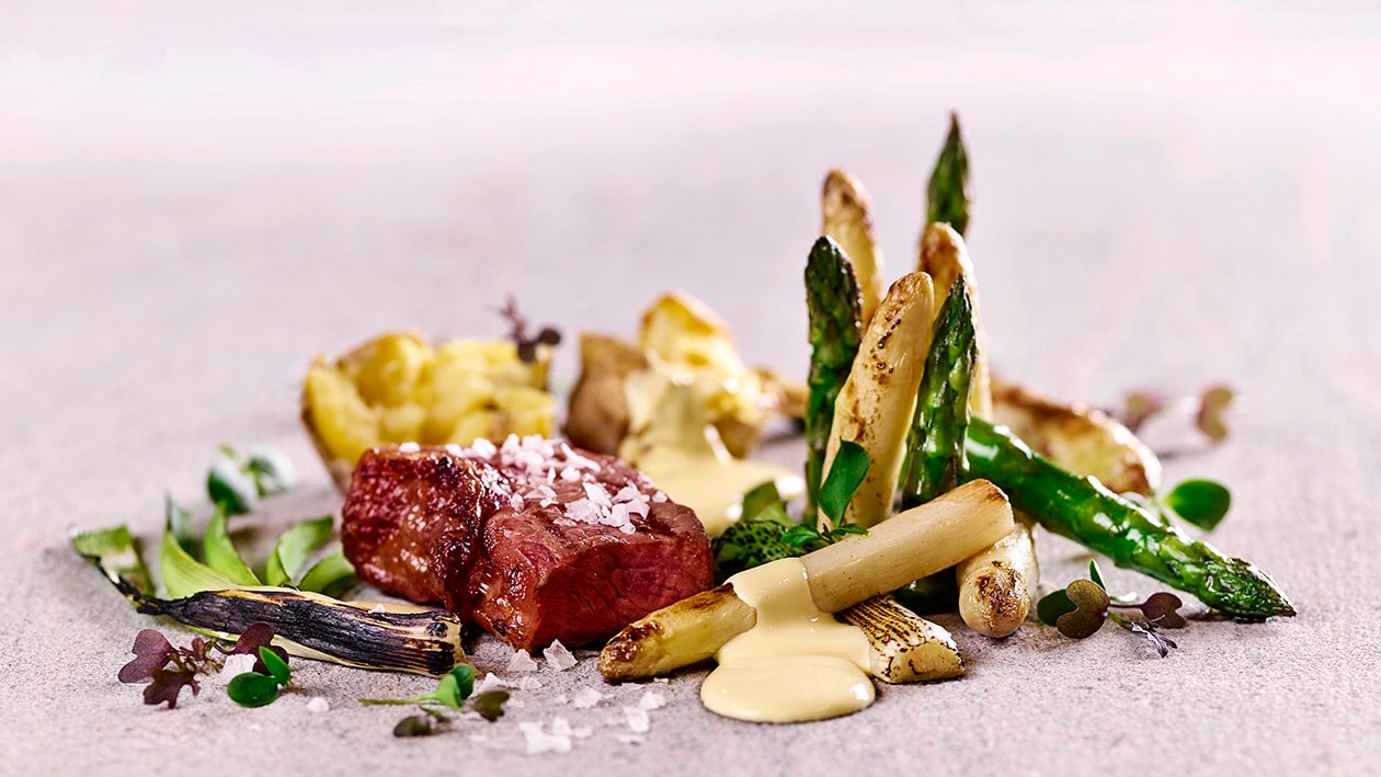 Striploin / Ackerspargel / Limetten-Hollandaise / Heurige Kartoffel