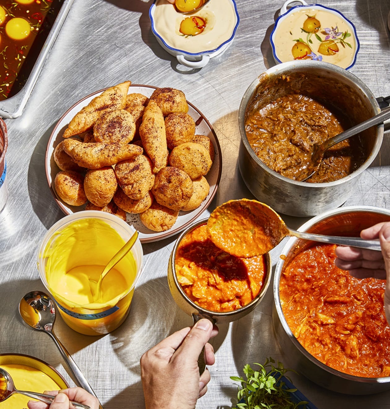 Teig-Revival mit Chili-Krabben-Sauce, Marmite-Sauce, Welsh-Rarebit-Sauce, Vatapá-Dip und geräuchertem Açaí-BBQ-Dip