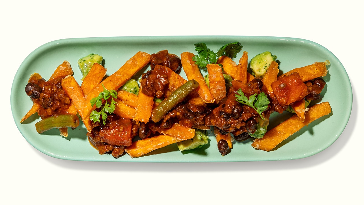 Tex Mex Loaded Sweetpotato Fries mit Avocado-Tomatensalat
