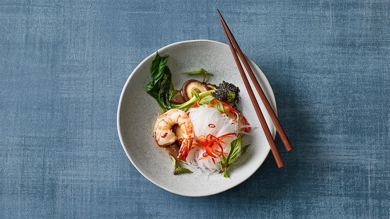 Thailändischer Glasnudelsalat mit sautierter Riesencrevette und Soja-Sesam-Vinaigrette